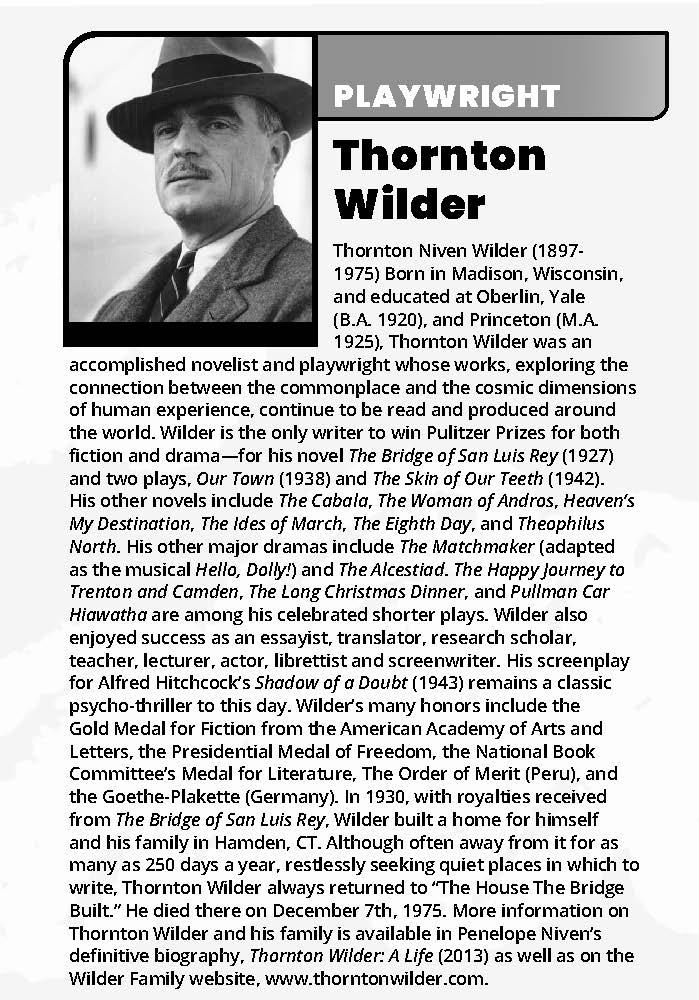 Each play in this year’s season is about a seemingly inconsequential person who ends up rocking their world: a small-town cop who is laughed at by an island’s inhabitants; a young girl who realizes the preciousness of life; an assistant trying to find a tenor; a mysterious midwife in a rural community; a female comedy writer in the 1950s; and a First Lady of the United States who redefined the role. Each person’s actions alter both their community and our perspective on the world.