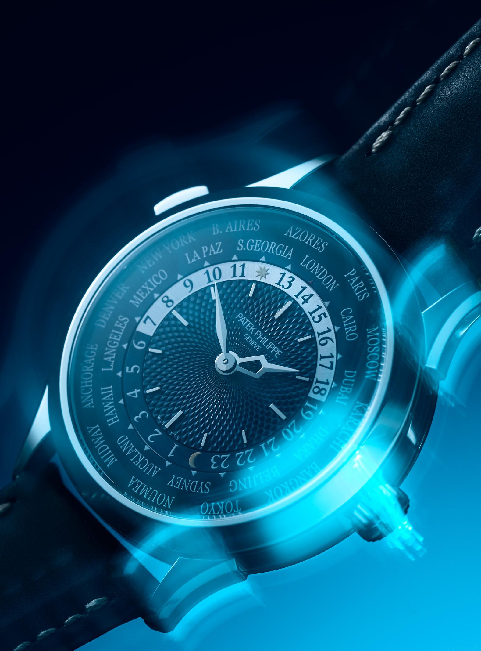 There are worldtimers, and then there is the Patek Philippe World Time. A direct descendant of the ingenious conceit mastered in the 1930s by Louis Cottier, perfected by his immediate client in 1999, the user can simultaneously correct the 24-hour time in all 24 major timezones in one-hour increments, by simply pressing the pusher at 10 o’clock, notching-on the 24-hour ring adjacent to the 24 cities named circumferentially. For the rst time, Patek Philippe is interpreting this cosmopolitan icon in a platinum and blue combo, with a dial adorned in radiantly hand-guillochéed texture, only adding to the faded glow of travel’s golden age.