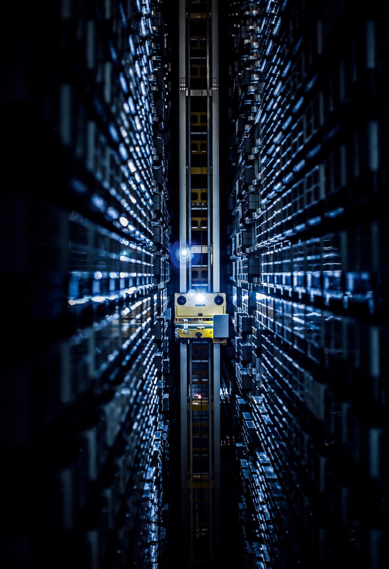 Some 30,000 boxes are distributed over four aisles, containing everything from movements to hands and cases to dials, all programmed by barcodes and shu ed in a mechanised ballet by Wall-E-like entities on a bungee. Only two acclimatised humans are allowed to enter this space, which maintains its atmospheric oxygen at 15% rather than 21%, so that it can’t burn.