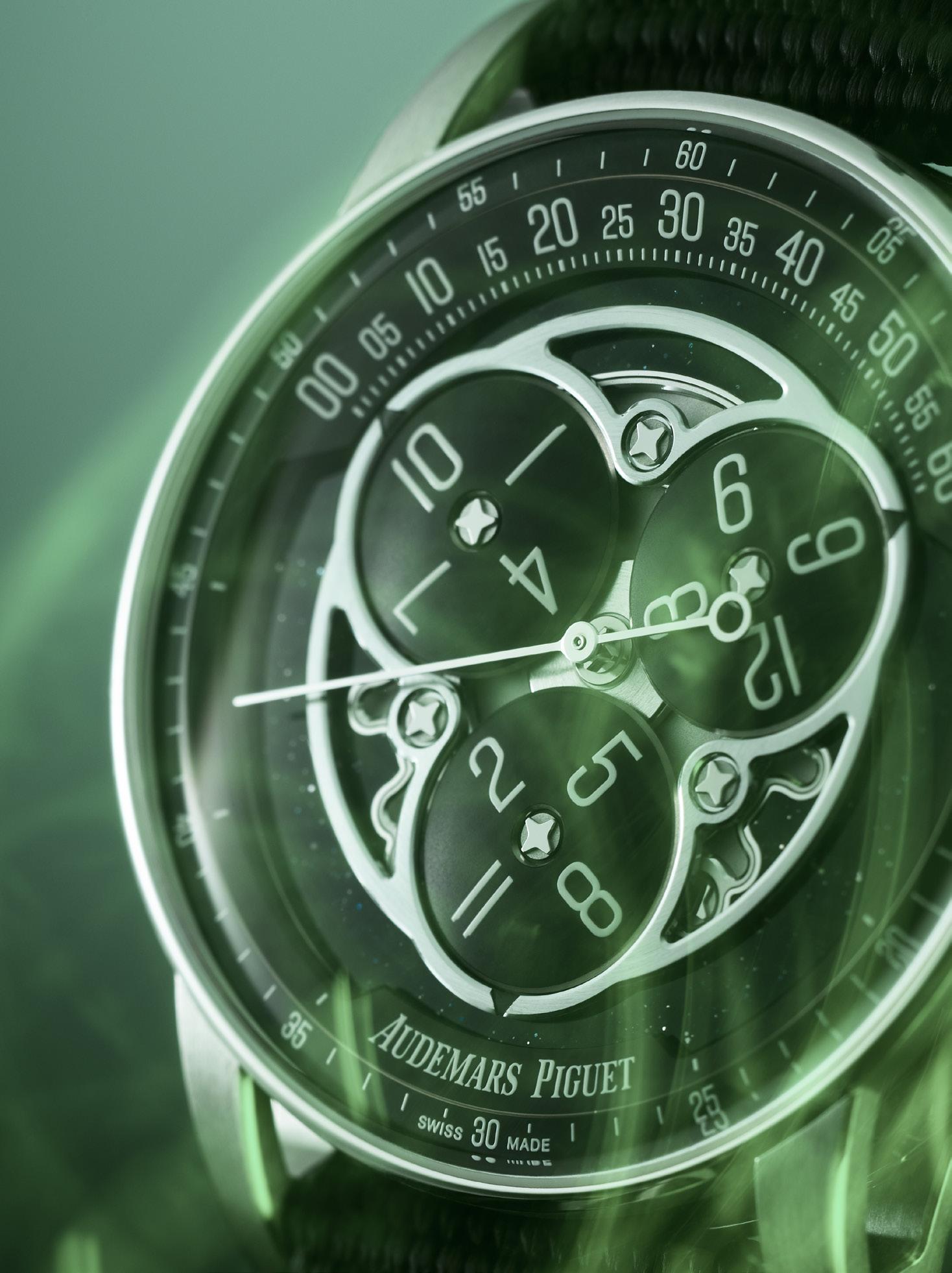 ‘Wandering hours’ were invented as far back as 1656, for a nocturnal wanderer in human form, Pope Alexander VII. Rome’s Campani brothers conceived for his insomniac holiness a backlit clock readable without the hassle of lighting a candle, and it lives on in miniaturised form as Audemars Piguet’s latest adventure in stripped-back ‘techno’ watchmaking. A teacup ride in wrist form, three hours ‘satellites’ take it in turns to track across a 120º minutes scale. When it’s time for a disc to begin another arc at 0 as the other reaches 60, a ‘starwheel’ nudges it round to align the next hour numeral accordingly. Amen to that.