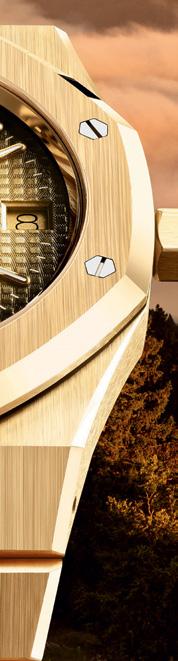 in AP’s slow-growing new 11.59 architecture; it adds simpli cation to the hypercomplication, reducing the typical panoply of bristling buttons to just three crowns and three push-pieces – including the ‘supercrown’ at four o’clock, combining yback chronograph zero-resetting with forward or backward correction of the month.