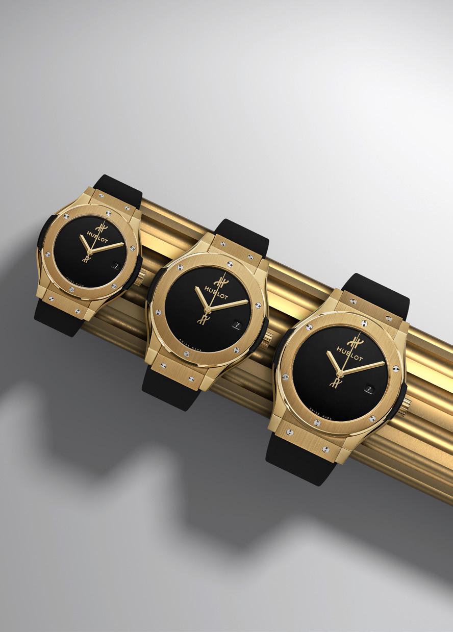 The scion of the Italian Binda Group dynasty, best known for making Breil watches, Carlo Crocco named Hublot a er the French word for his out-there ‘porthole’ case design – screws to the front, steampunk-goes-luxe. But it wasn’t the case that had consumed three years’ R&D previous. It was Crocco’s decision to t the rst-ever strap in Swiss history that combined natural rubber with synthetic. Not only that, but t rubber, whatever the origin story, to luxurious gold.