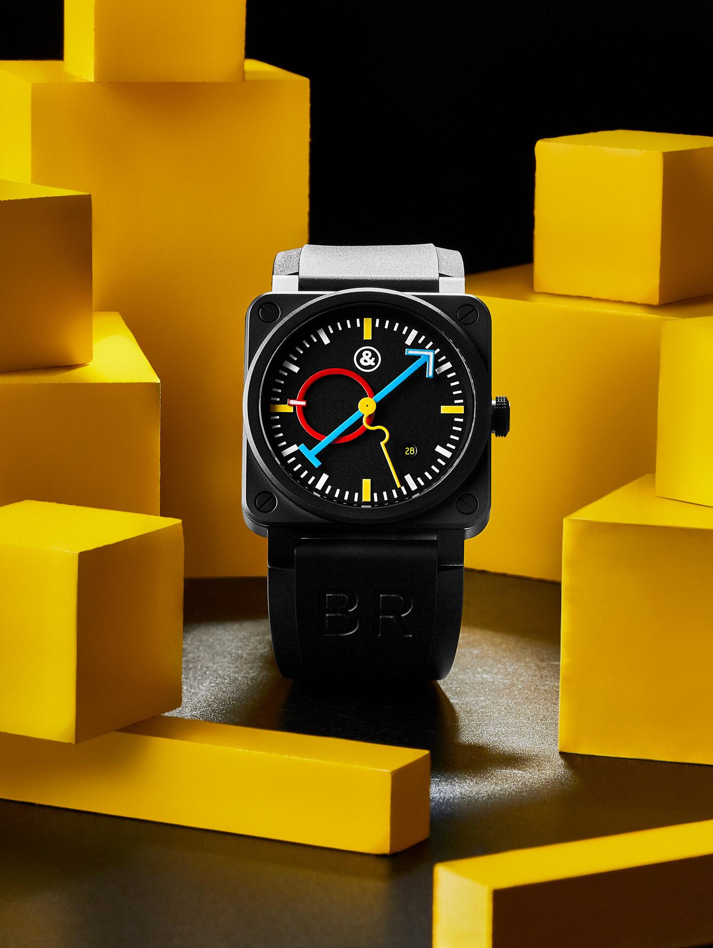 In 1987, French interior-architectturned-watch-designer Alain Silberstein unveiled his colourful, childlike Krono Bauhaus. Kandinsky, Miró and Ettore Sottsass’s abstract Memphis movement in miniature, wrist-worn form. To that list of modernism, M Silberstein can now add cubism, thanks to the strippedback utility of fellow Frenchmen, Bruno ‘Bell’ Belamich and Carlos ‘Ross’ Rosillo. Their Swiss-made watch brand has, since the ’90s, equipped bomb disposal squads, SWAT teams, naval air arms and deep-sea divers. But it speaks volumes of Bell & Ross’s design-forward nous that a watch inspired by – and intended to complement – any pilot’s squared-up cockpit instrument array can translate so e ortlessly to the whimsical primaries and playful geometries of Silberstein.