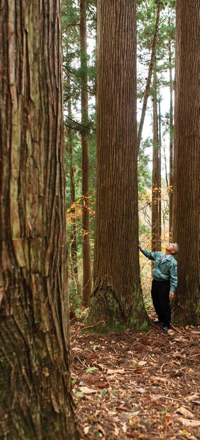 LEFT Yoshiyuki Itotani, Plant Manager at Nakamoto Zourin, among the cypress trees in Hiroshima, Japan.