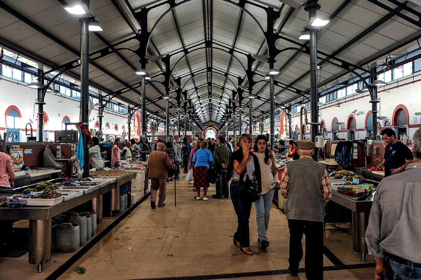 Ou então voltamos cá na primavera.” Fiquei a ponderar na oferta do meu distinto amigo, enquanto nos pusemos a andar pela Rua de Martim Fartopelo que consta um indivíduo de fé e sobejamente endinheirado - e pelas demais ruelas estreitas e sinuosas. Entrar na Praça da República após atravessar a cerca intimista do Con vento do Espírito Santo é uma visão agradabilíssima: largos passeios, agradáveis comércios. Só mais tarde percebemos que o nosso percurso pelo núcleo antigo acompanhara os passos de um outro andarilho, este bem mais recente(4). Vou citá-lo: “O viajante dei xa-se levar pela intuição e mete-se pelo labirinto de ruelas […] até desembocar frente ao edifício do mercado, com as suas chamativas cúpulas vermelhas […] que sugerem uma decoração das Mil e Uma Noites.”