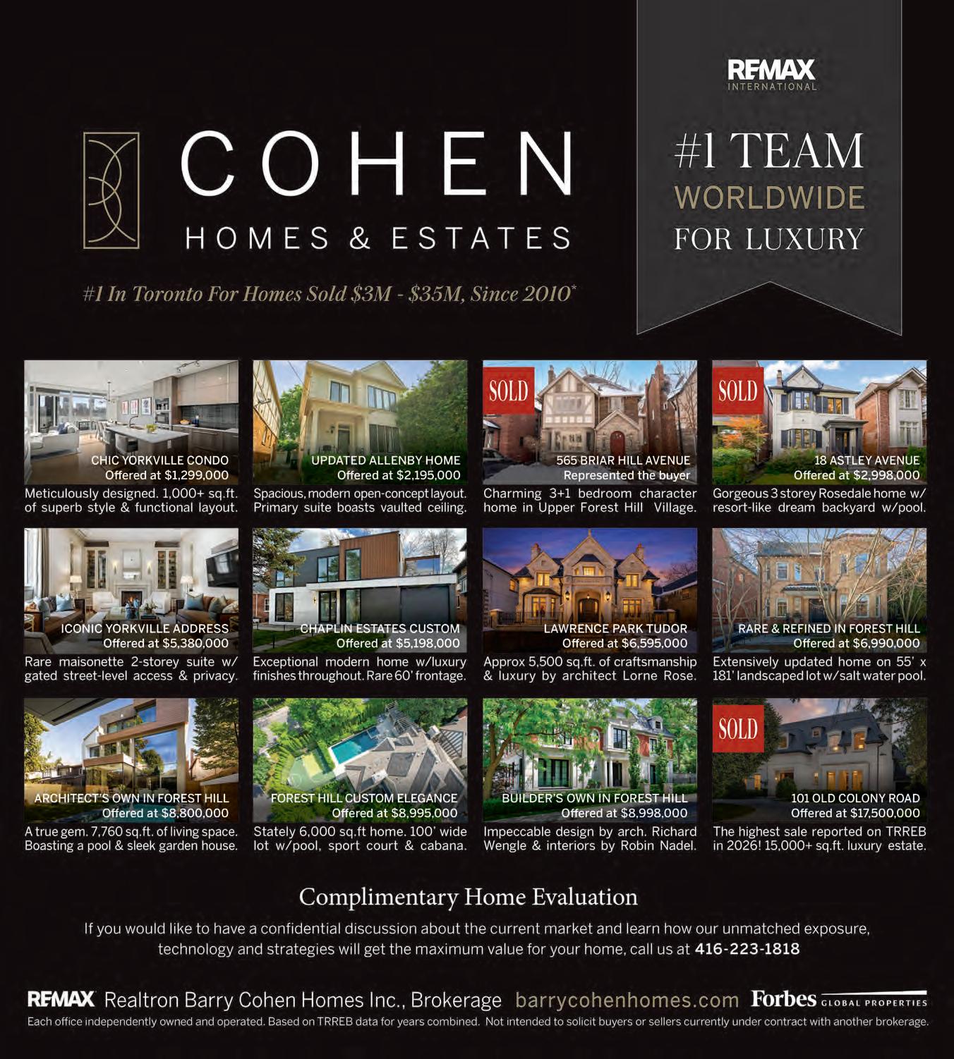 Captivating Forest Hill home. Wealth of wall-to-wall & flr-to-clng wndws, mahogany & limestone flrs. French drs opening to Juliette balconies & covered terraces. LL entertainment room, gym & spa. Elise Kalles** Sarah Collins* 416-509-9020