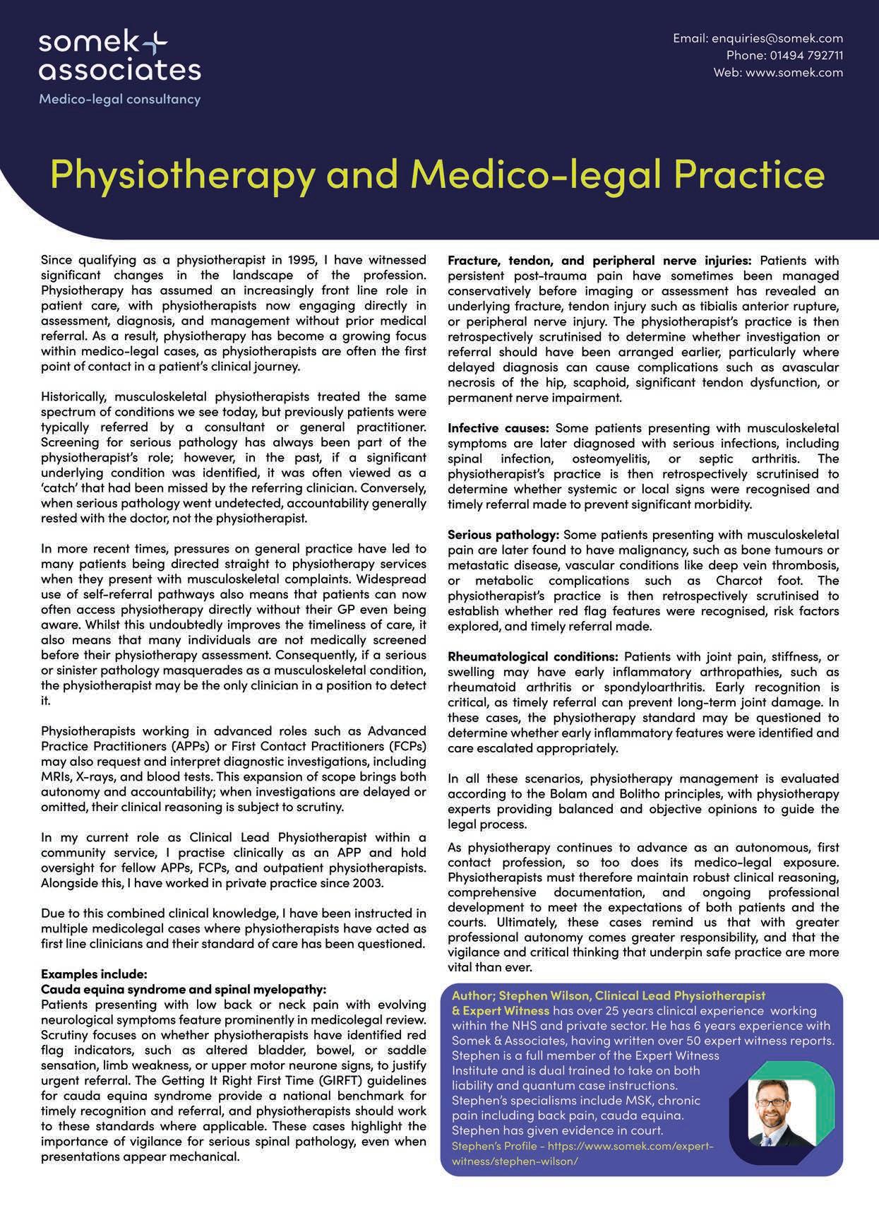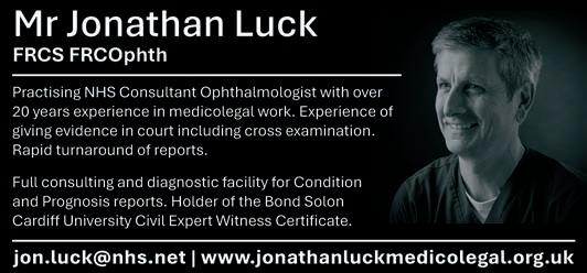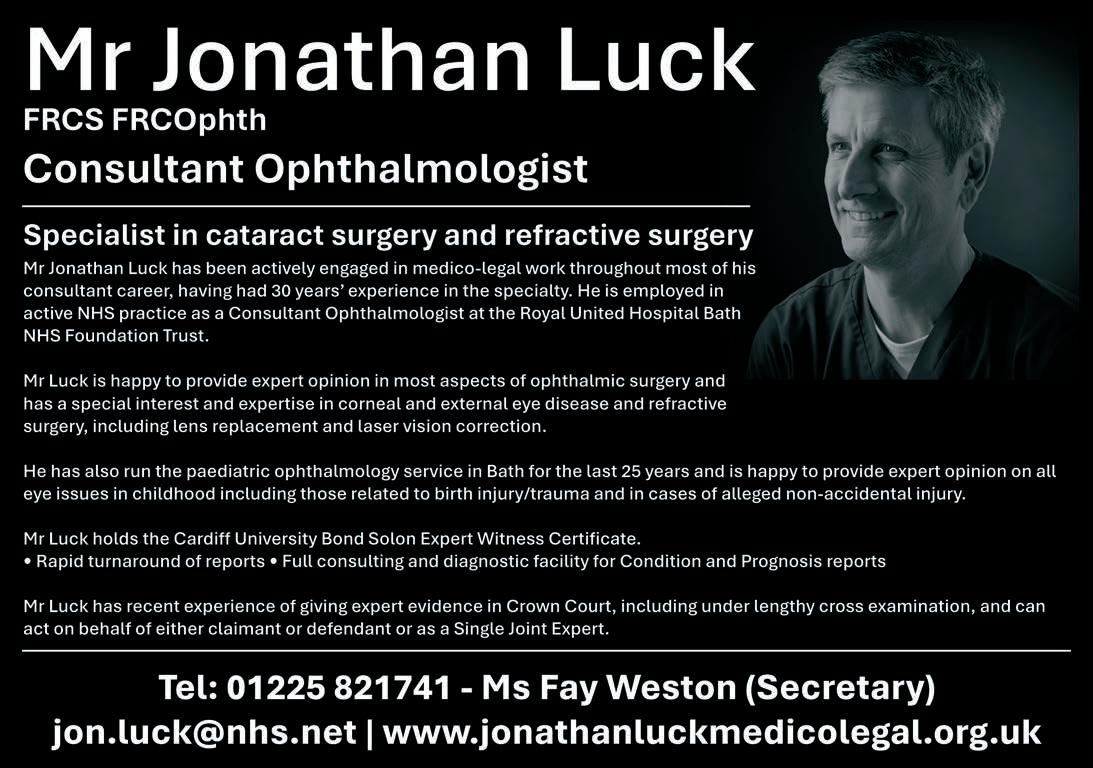 Mr Jonathan Luck has over 20 years of experience in medicolegal work. Experience of giving evidence in court including cross examination. Rapid turnaround of reports. Full consulting and diagnostic facility for Condition and Prognosis reports. Holder of the Bond Solon Cardiff University Civil Expert Witness Certificate.