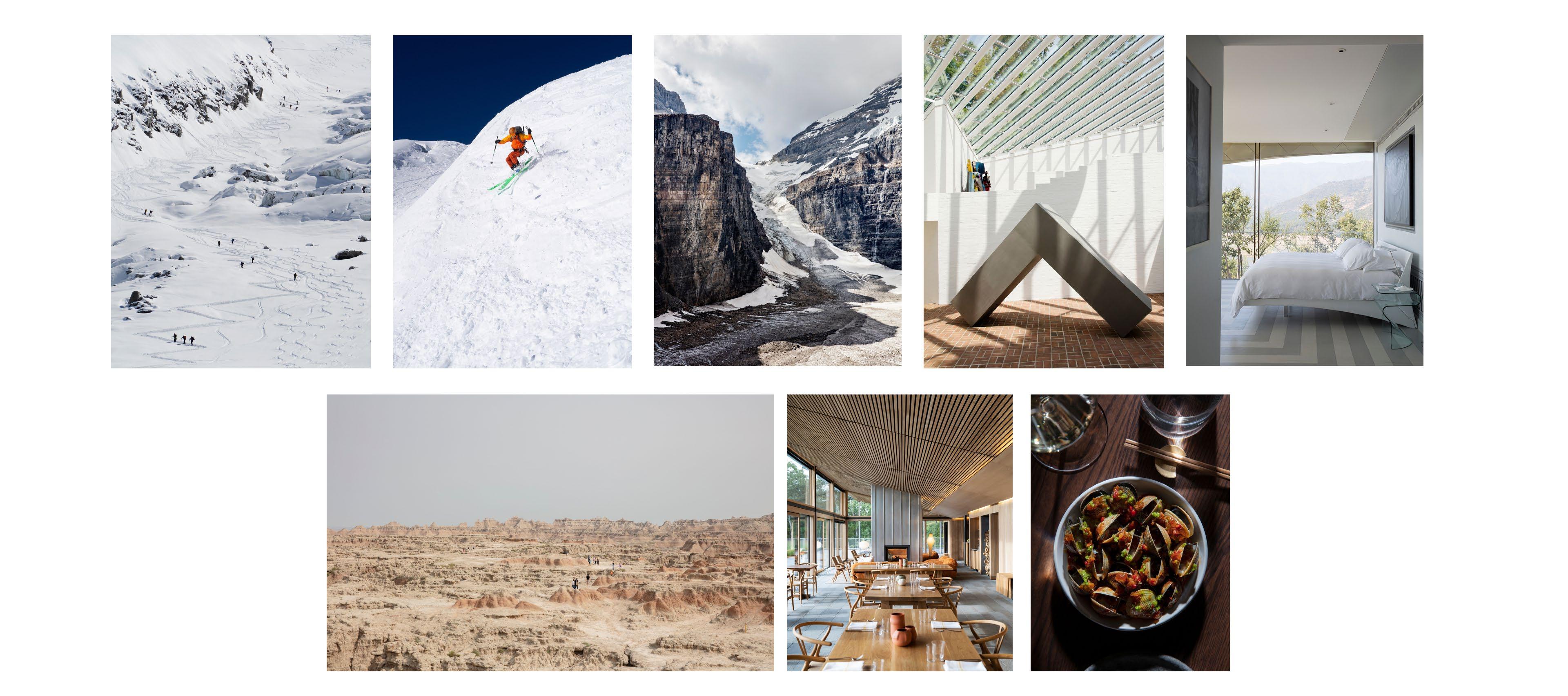 Powder Mountain captures Awe through vast open shots of terrain and skiers in action. Shots are wide and with few people spread out or by themselves in the environment.