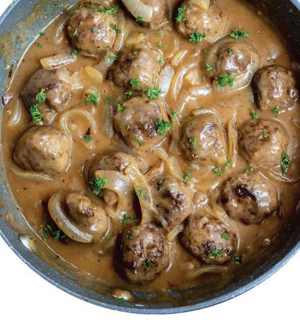 To the onions and mushrooms, add gravy, soup, water, and stir to incorporate. Add a little pepper for flavor. When this comes to a simmer, add meatballs.