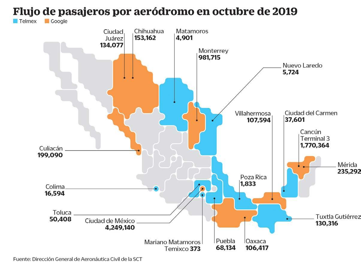 En tanto, Google Stations, la red de wifi gratuito de la empresa estadounidense, ofrece internet en 23: los aeropuertos internacionales de Ciudad Juárez, Chihuahua, Reynosa, Culiacán, Torreón, Monterrey, Durango, Mazatlán, Zacatecas, San Luis Potosí, Tampico, Veracruz, Ciudad de México, Zihuatanejo, Acapulco, Oaxaca, Huatulco, Minatitlán, Villahermosa, Tapachula, Mérida, Cancún Terminal 3 y Cozumel.