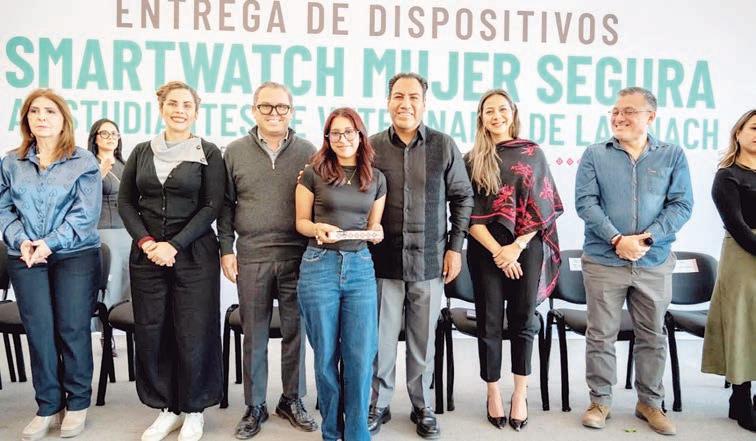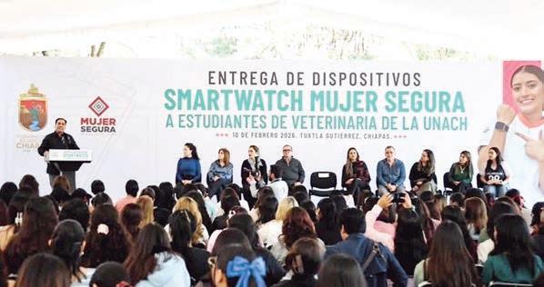 De igual forma, resaltó la colaboración con la Unach para brindar una atención integral a las estudiantes y dio a conocer que se puso a disposición una unidad móvil con servicios de atención psicológica y jurídica en las facultades, la cual canaliza los casos a la Fiscalía General del Estado o al Tribunal Superior de Justicia. Con ello, refrendó la disposición de la Semuigen para continuar trabajando en favor de la seguridad y una vida libre de violencia para las mujeres. El rector de la Unach, Oswaldo Chacón Rojas, agradeció al gobernador Eduardo Ramírez la entrega de los relojes inteligentes y reconoció que esta acción ya ha beneficiado a diversas facultades, contribuyendo a la construcción de una universidad más segura y libre de violencia y acoso, problemáticas que históricamente han afectado a las mujeres. Destacó que esta es la tercera ocasión en que un gobernador visita la Facultad de Medicina Veterinaria, única en su espe-