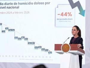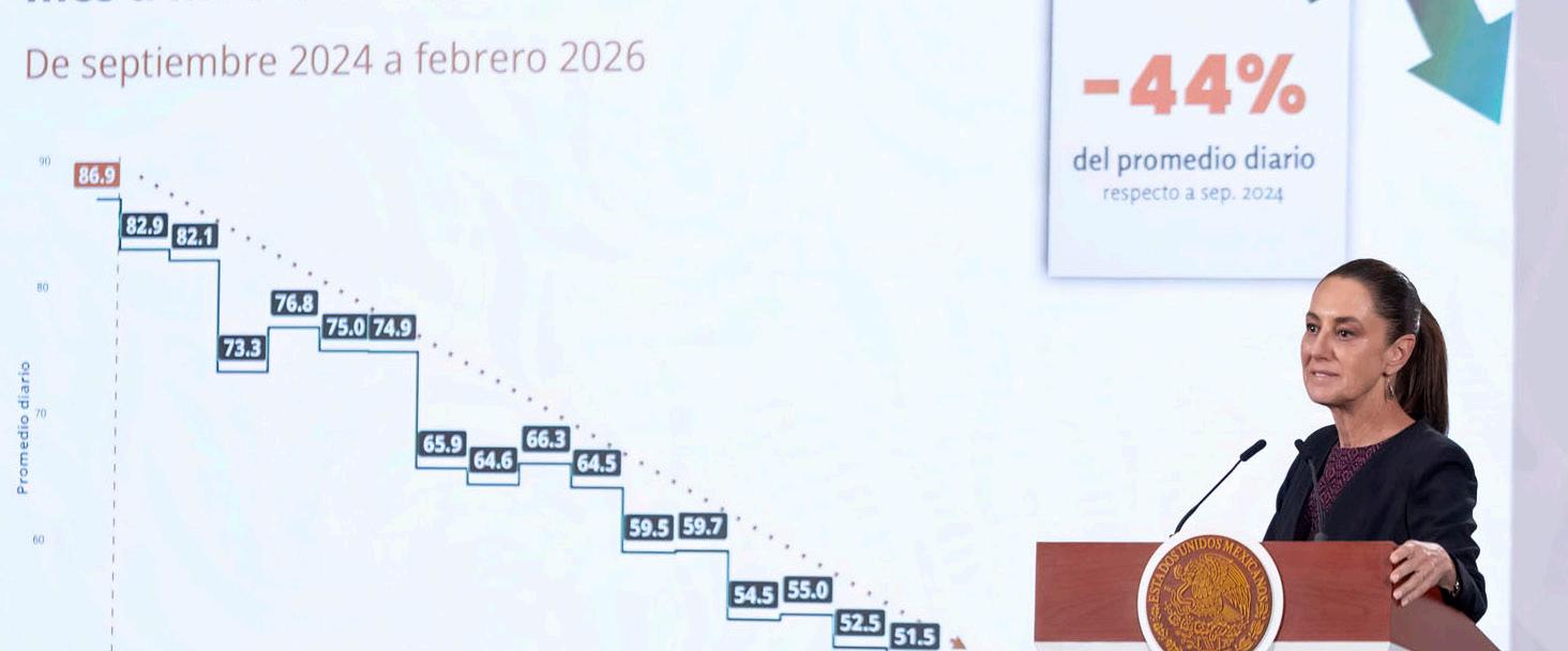 La Presidenta de México, Claudia Sheinbaum Pardo, destacó que, gracias a la Estrategia Nacional de Seguridad, los homicidios dolosos en el país disminuyeron 44 por ciento, de septiembre de 2024 a febrero de 2026, al pasar de un promedio diario de 86.9 a 48.8, lo que representa una reducción de la violencia de 38 homicidios diarios menos; siendo febrero de este año el más bajo desde 2015.