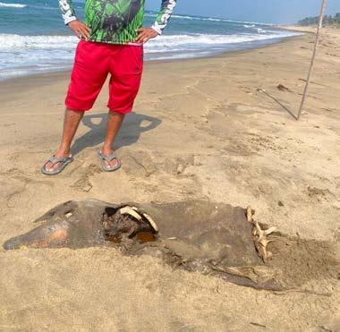 Fueron pescadores y pescadores del Ejido Colorado y Guillermo Prieto quienes reportaron la presencia del espécimen a la altura del kilómetro 15 sobre la franja costera. En los alrededores sobre la playa también fueron localizados restos aceitosos de material petrolífero que ha recalado a esta zona.