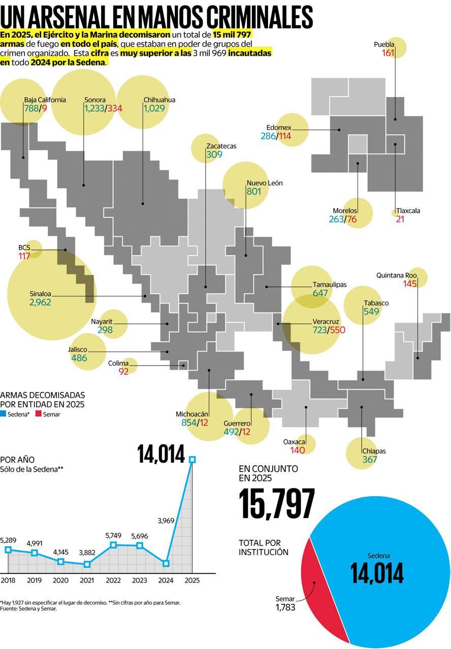 Las cifras oficiales reportan que elementos de la Secretaría de la Defensa Nacional (Defensa) aseguraron durante 2025 —prácticamente el primer año del gobierno de la presidenta Claudia Sheinbaum— 14 mil 14 armas de fuego, una cifra que casi cuadruplica lo decomisado en 2024, cuando se incautaron casi 4 mil pertrechos.