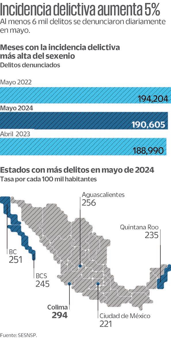 Al menos 6 mil delitos se denunciaron diariamente en mayo, en el que la incidencia delictiva aumentó 5% con respecto a abril de este año que acumuló 181 mil 829 carpetas de investigación por diversas faltas a la ley.