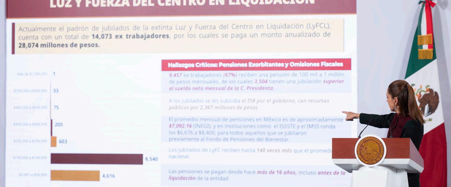 La secretaria Anticorrupción y de Buen Gobierno, Raquel Buenrostro Sánchez, detalló que entre las pensiones exorbitantes entre personal de confianza destacan: Luz y Fuerza del Centro en Liquidación con 9 mil 457 extrabajadores que reciben una pensión de 100 mil a 1 millón de pesos, de los cuales, 3 mil 504 tienen una jubilación mayor al sueldo neto mensual de la Presidenta.