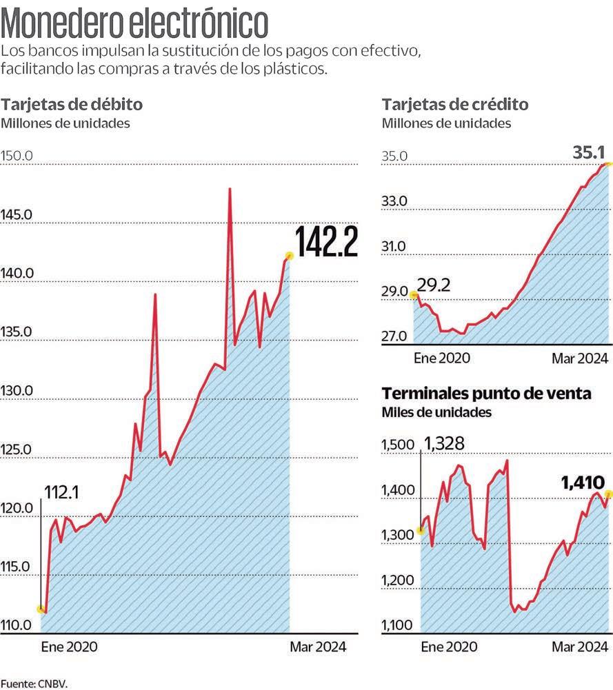 De acuerdo con datos de la Comisión Nacional Bancaria y de Valores (CNBV), al cierre del primer trimestre de 2024 se contabilizaron 142 millones de tarjetas de débito en circulación en el país, 35 millones de tarjetas de crédito y 1.4 millones de terminales punto de venta.