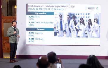 El director del IMSS mencionó que estos más de nueve mil especialistas estaban vinculados a necesidades del propio Instituto en turnos y en especialidades específicas. Agregó que se hizo una apertura también para la contratación de médicas y médicos que no necesariamente se hayan formado en el IMSS: “El 67% sí lo hizo 6 mil 313 médicas y médicos vienen de residencias propias del IMSS; es decir el IMSS forma y después contrata, y también hubo 3 mil 110 de otras instituciones”.