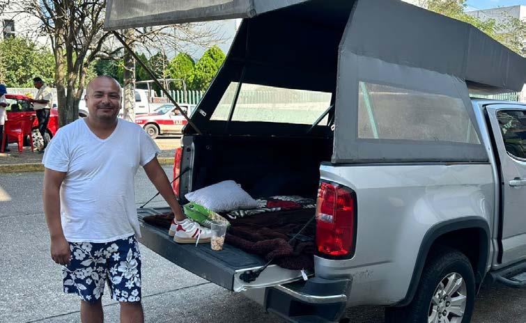 En cuatro días Luis adaptó la batea de su camioneta para poder descansar, resguardarse de la lluvia y el sol mientras espera noticias de su suegro hospitalizado en Coatzacoalcos.