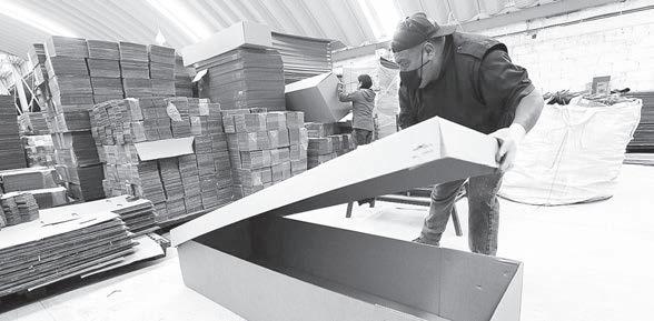Al observar que las clínicas y funerarias no se dan abasto ante la cantidad de decesos por Covid-19, lo que incluso provocó que algunos hospitales colocaran cadáveres en bolsas de basura, la empresa KJ Cajas de Cartón diseñó y produjo ataúdes de este material, con el objetivo de facilitar, dignificar y economizar la entrega de los fallecidos a sus familiares, dijo Gonzalo Galera, director General de la firma localizada en Toluca. Comentó que la elaboración de cajas se redujo al inicio de la contingencia, por lo que se dieron a la tarea de buscar nuevos productos y por ello diseñaron un ataúd económico y fácil de transportar. Actualmente produce entre 8 mil y 10 mil ataúdes diarios cada uno con un costo de 220 pesos más IVA.