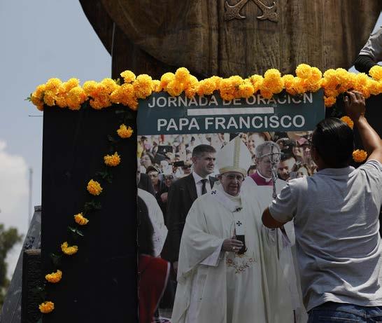 mientras la fotografía del Pontífice orando frente a la Virgen María luce al costado derecho junto con la bandera del Vaticano.