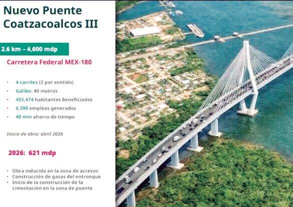En 2026, la SICT invertirá 11 mil 103 mdp para realizar obras de infraestructura y se generarán 33 mil 309 empleos. La inversión incluye la construcción del puente Coatzacoalcos III. PASE A LA 2/3