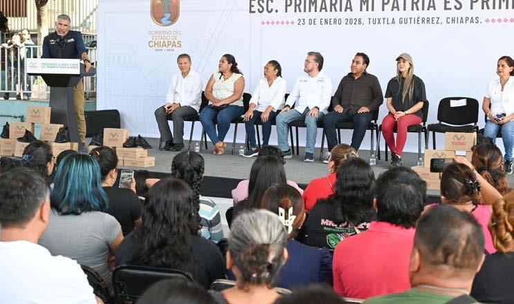 El gobernador Eduardo Ramírez Aguilar visitó la Escuela Primaria Mi Patria es Primero, en Tuxtla Gutiérrez, donde encabezó la entrega de apoyos del programa A Paso Firme, iniciativa orientada a fortalecer el bienestar y la seguridad de la niñez chiapaneca mediante la dotación de tenis escolares, con el propósito de mejorar su comodidad y garantizar condiciones dignas para su desarrollo integral. Durante su intervención, explicó que su gobierno impulsa diversas acciones para brindar a las y los estudiantes mayor seguridad en sus trayectos y motivarlos en su aprendizaje y actividades diarias. “Hoy estamos haciendo