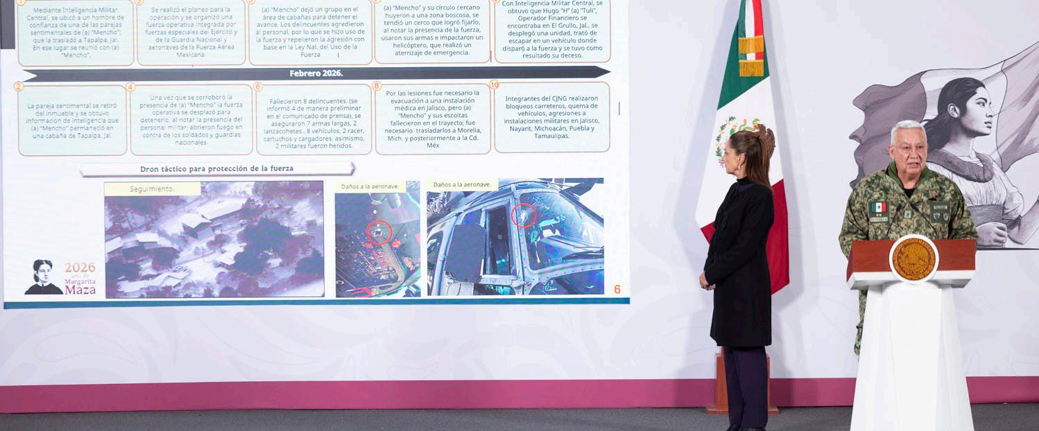 Palacio Nacional, la presidenta Claudia Sheinbaum Pardo y miembros de su gabinete respaldaron la labor de la Sedena tras el operativo que resultó en la muerte de Nemesio Oseguera Cervantes, identificado como líder del CártelJalisco Nueva Generación. En el encuentro se puso en valor la actuación de las fuerzas federales en dicha acción, en línea con la estrategia del Gobierno de México para combatir a la delincuencia organizada y fortalecer la seguridad en el territorio nacional.