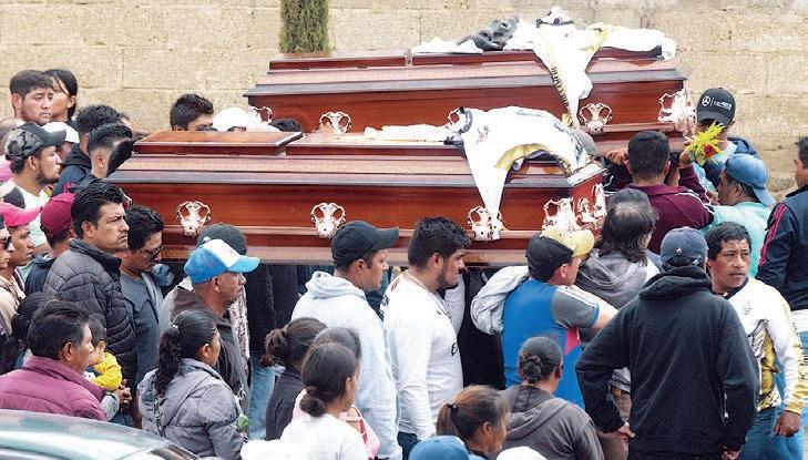Cada una de las cajas de madera es cargada por 12 hombres; los varones se turnan para tener el privilegio de acompañar a sus amigos que murieron por heridas de bala cuando huían de la batalla iniciada por los policías antimotines y de la Fuerza Civil que dirige el secretario Cuauhtémoc Zuñiga Bonilla. Hasta adelante del sepelio va un tractor, y luego una camioneta con una torreta que lleva globos, listones de colores y a su lado caminan menores de edad y mujeres con diversos vestuarios que utilizan en la Danza de los Gracejos.