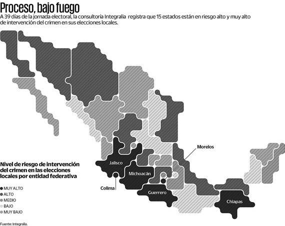 A 39 días de la jornada electoral, un estudio de Integralia —elaborado con información oficial y reportes de los partidos políticos— registra que 15 estados están en riesgo alto y muy alto de intervención del crimen en sus elecciones locales.