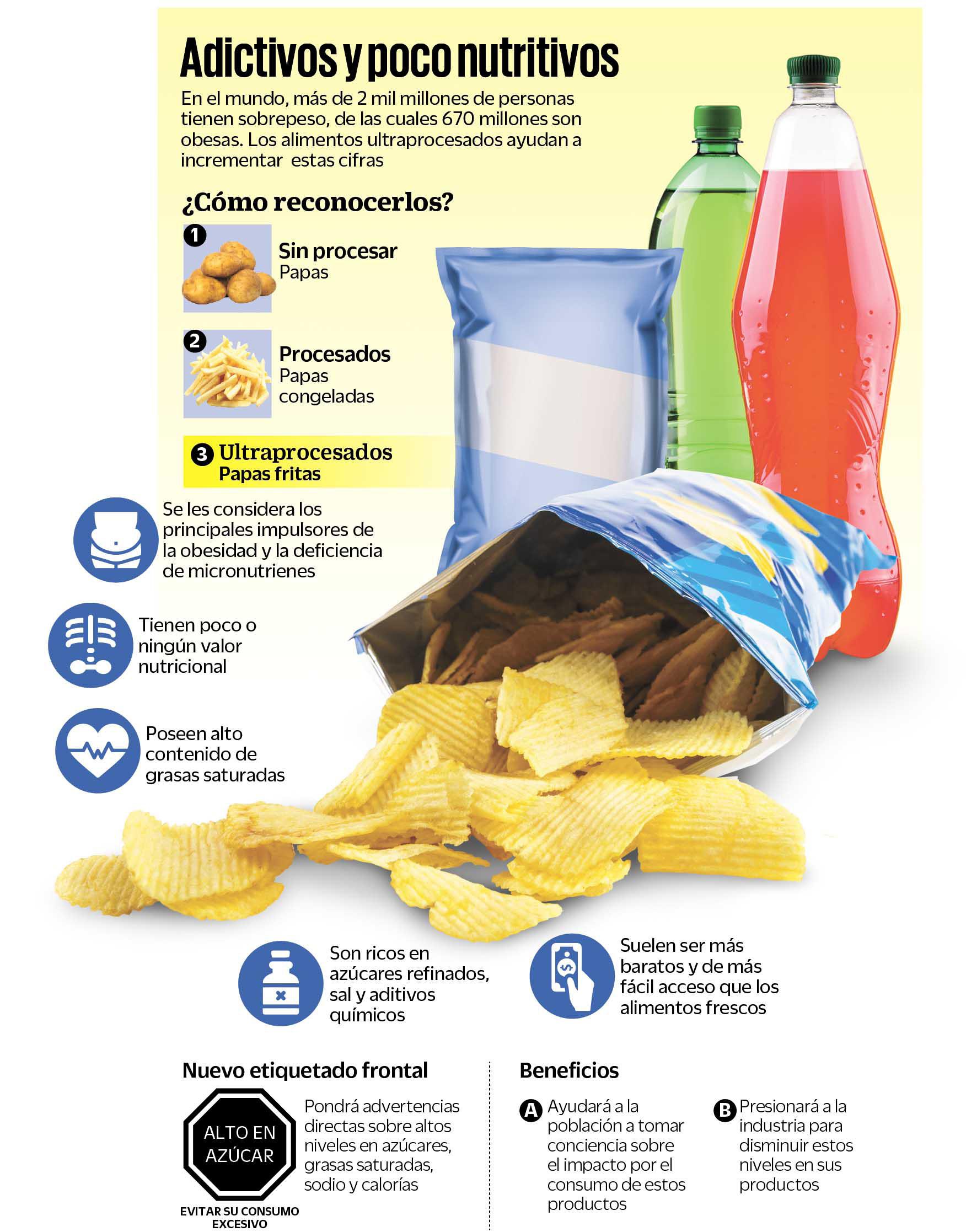 Una mordida no basta: son exageradamente sabrosos o eso nos hacen creer. Tras la explosión de chocolate y crema batida o el adictivo crujir de una papa frita hay una larga lista de grasas, almidones, aglutinantes, azúcares, emulsificadores, saborizantes, solventes, aromatizantes, espesantes y estabilizadores mediante los que son procesados para recrear una deliciosa fantasía que inunda 80% de los estantes de los supermercados también en forma de galletas, cereales, jugos, tartas, frituras, helados y cientos de productos seductores.
