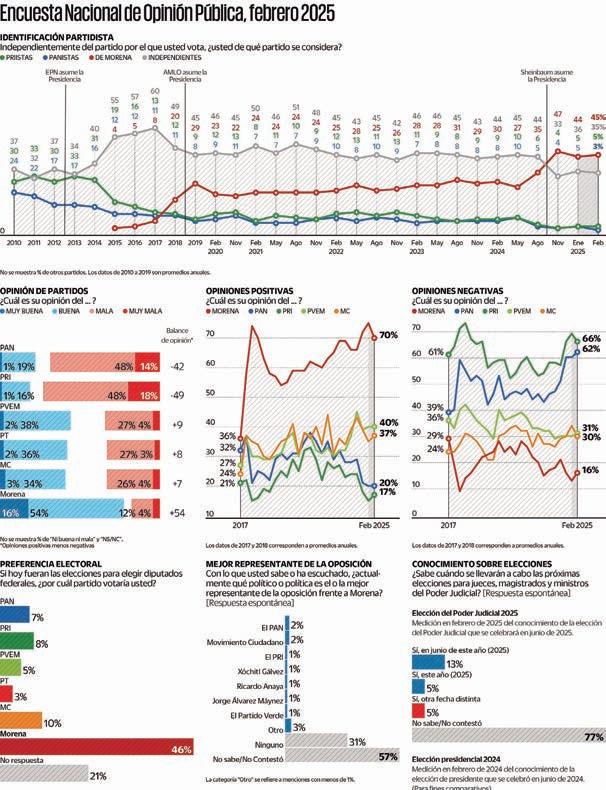 durante la campaña presidencial del año pasado. Uno de los aspectos más relevantes del estudio es la falta de una figura sólida que encabece la oposición. Cuando se preguntó a los ciudadanos a quién consideran el mejor representante opositor, las respuestas fueron dispersas, lo que refleja la fragmentación del bloque contrario a Morena: 31% respondió que nadie y 57% no pudo mencionar un nombre. Además del proceso legislativo, la encuesta evaluó el nivel de conocimiento sobre la elección del Poder Judicial progra-