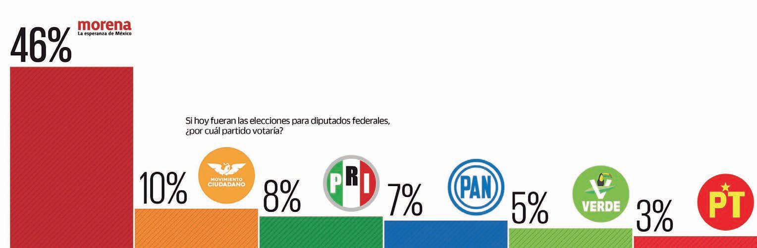 21% no ofrecen respuesta. Por primera vez desde que se tiene registro, ni el PAN ni el PRI ocupan la segunda posición en las preferencias electorales. En esta ocasión, el segundo lugar corresponde a Movimiento Ciudadano, que alcanza 10% de las preferencias, aunque sigue estando muy por detrás de Morena.