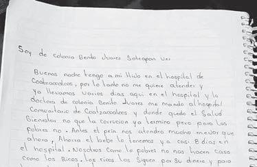 Coatzacoalcos, ver.- Una madre de familia suplicó, mediante una carta escrita a mano, que su bebé reciba atención médica urgente en el Hospital IMSSBienestar “Dr. Valentín Gómez Farías” de Coatzacoalcos, donde permanece internado desde hace una semana sin que se le practique la intervención quirúrgica que, asegura, es necesaria para salvarle la vida.