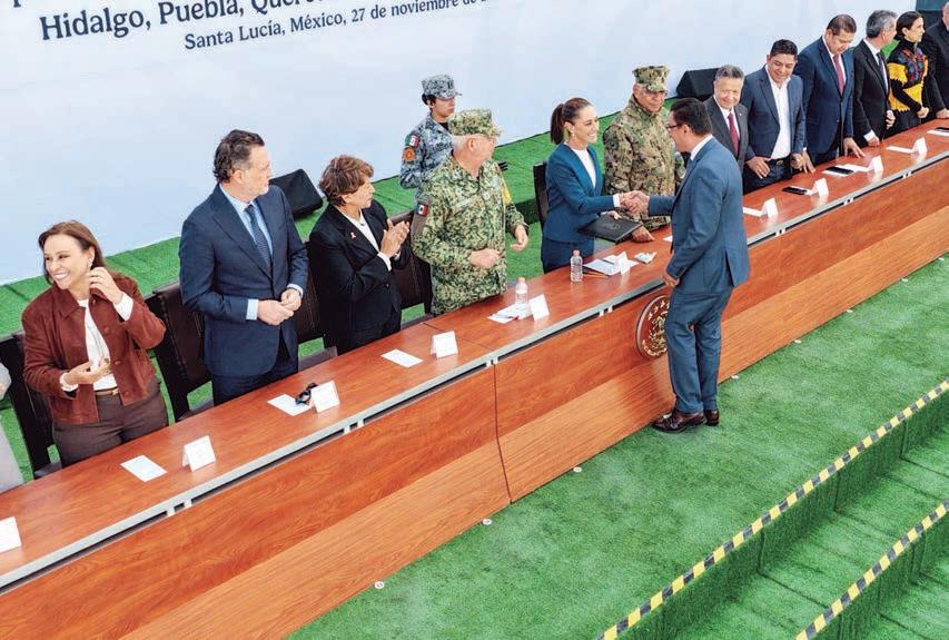 La gobernadora Rocío Nahle García participó en la Ceremonia de reconocimiento al personal que participó en la aplicación del Plan DN-III-E y Plan Marina en Hidalgo, Puebla, Querétaro, San Luis Potosí y Veracruz, encabezada por la presidenta Claudia Sheinbaum Pardo en la Base Aérea Militar Número 1. A nombre del pueblo de Veracruz, la