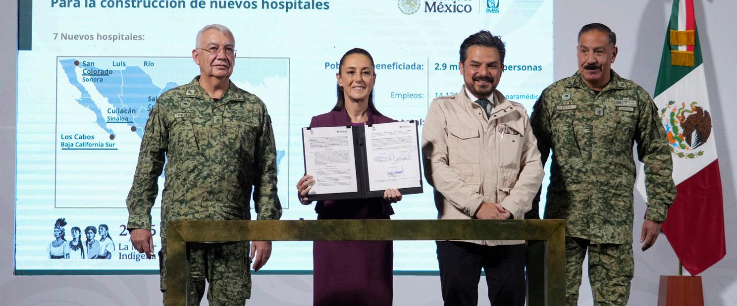 La Presidenta de México, Claudia Sheinbaum Pardo, anunció la construcción de siete nuevos hospitales del Instituto Mexicano del Seguro Social (IMSS) que serán realizados por ingenieros de la Secretaría de la Defensa Nacional, con lo que se beneficiará a