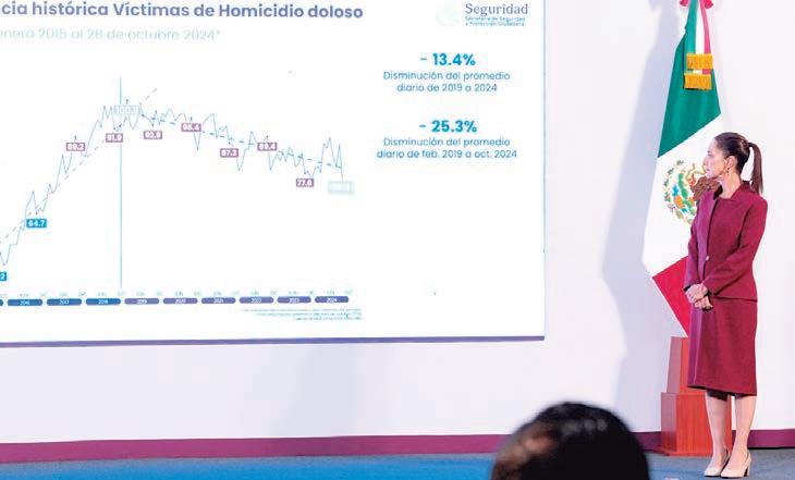 Vamos a seguir disminuyendo los delitos de alto impacto: Sheinbaum De febrero 2019 a septiembre 2024, hubo una reducción del 40.38 por ciento en el promedio diario de delitos de alto impacto. PASE A LA 12