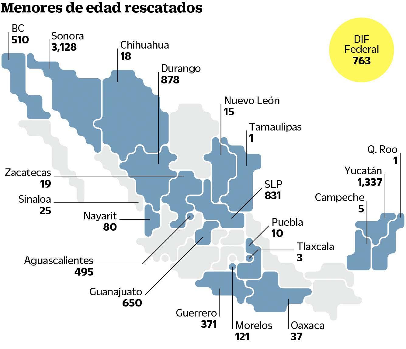 En respuesta a las solicitudes de información enviadas a todos los DIF estatales y al federal, estos estados respondieron que no es su competencia separar a los menores de sus padres. A diferencia de esas 12 zonas del país, Sonora fue el estado que informó de un mayor número de separaciones de hijos y padres, con 3 mil 128 casos; en Yucatán, mil 337; en Durango, 878; en San Luis Potosí, 831; en Guanajuato, 650; en Baja California, 510; en Aguascalientes, 495; en Guerrero, 371; en Morelos, 121, y en Nayarit, 80.