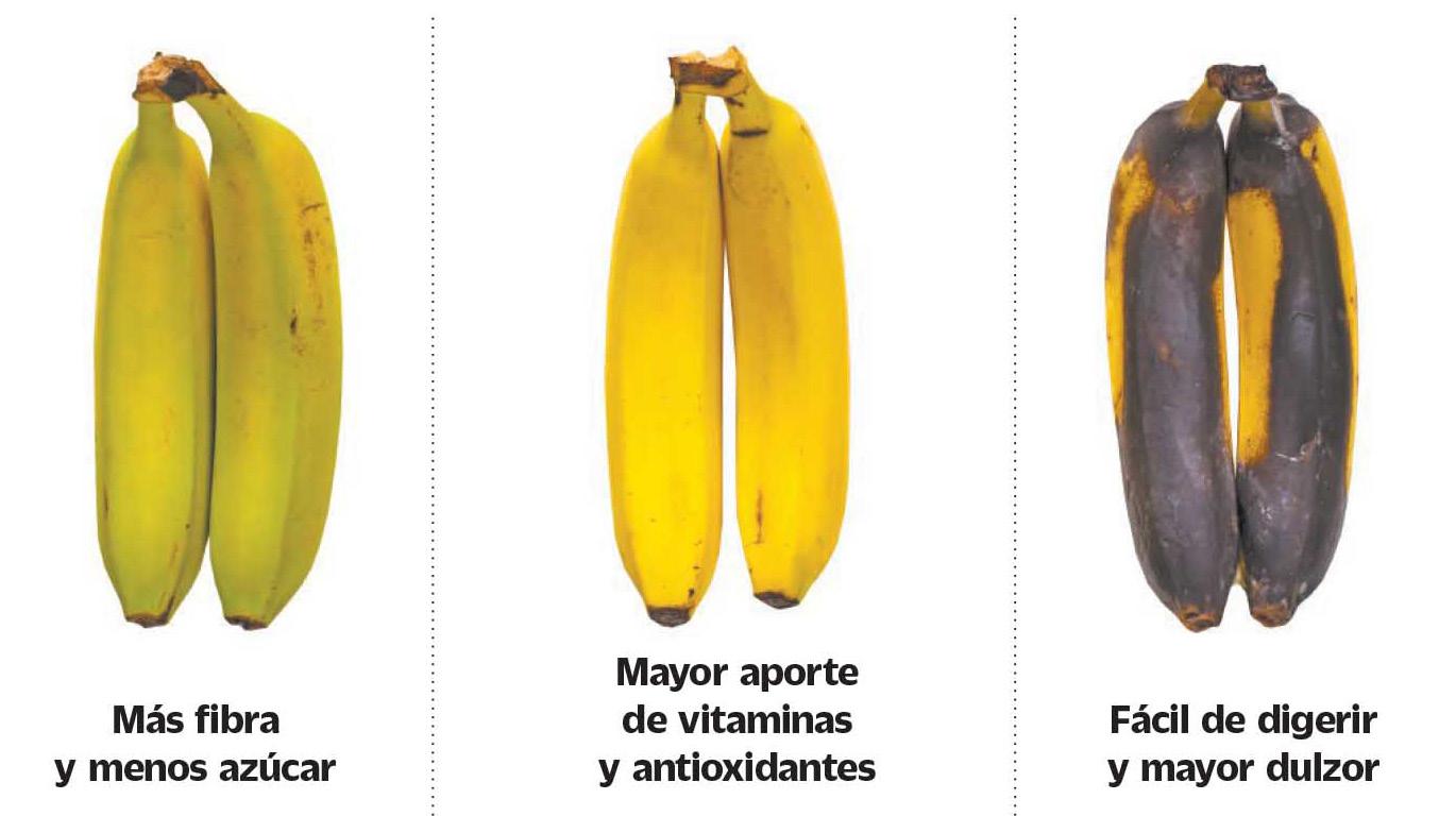 Tanto los plátanos verdes como los maduros son saludables y aportan las mismas kilocalorías. Sin embargo, mientras más maduros, menos aporte de pectina y de almidón resistente y más alto es el índice glucémico (velocidad con la que un alimento eleva la glucosa en sangre).