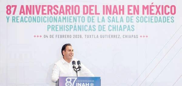 rescate y la recuperación de áreas, edificios y monumentos históricos. Señaló que estas acciones contribuyen al fortalecimiento de la actividad turística en la entidad. Por su parte, la secretaria de Infraestructura, Anakaren Gómez Zuart, resaltó el trabajo conjunto con el INAH para el reacondicionamiento de la Sala de Sociedades Prehispánicas de Chiapas, realizado con estricto apego a los lineamientos de conservación. Asimismo, celebró los 87 años de creación del Instituto a nivel nacional y 55 en Chiapas, y precisó que, por instrucción del gobernador Eduardo Ramírez, la Nueva ERA mantendrá la coordinación interinstitucional para preservar el legado, el patrimonio y la memoria del pueblo chiapaneco.