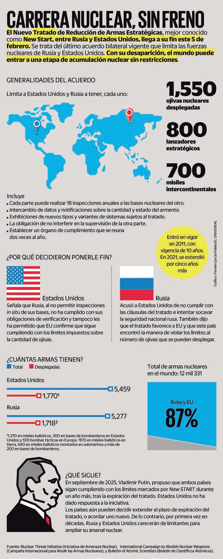 a reducir su arsenal atómico en dos tercios, a mil 550 ojivas desplegadas, 800 lanzadores estratégicos desplegados y no desplegados y no más de 700 misiles balísticos intercontinentales, misiles balísticos lanzados desde submarinos y bombarderos pesados desplegados. El acuerdo reemplazó al Start I y Start II, y al Tratado de Moscú, con los que se buscó evitar una carrera nuclear que amenazara al mundo entero. Más, cuando ninguna de las dos naciones ha firmado el Tratado de Prohibición de Armas Nucleares. La administración de Donald Trump no cree en limitar las armas nucleares. En febrero pasado, ordenó reanudar las pruebas de arsenal atómico, para estar a la par de países como Rusia y China. “Debido a los programas de pruebas de otros países, he dado instrucciones al Departamento de Guerra para que inicie pruebas de nuestras armas nucleares en igualdad de condiciones”, explicó el mandatario. Documentos obtenidos por NPR, la radio pública de Estados Unidos, mostraron que el gobierno de Trump ha revisado una serie de directivas sobre seguridad nuclear y las ha compartido con las empresas que tiene a su cargo regular, con el objetivo de acelerar el desarrollo de una nueva generación de diseños de reactores nucleares. Los documentos indican que el Departamento de Energía supervisa un programa para construir al menos tres nuevos reactores nucleares comerciales experimentales antes del 4 de julio de este año.