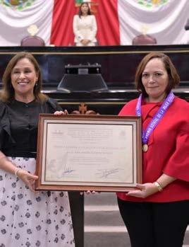 En sesión solemne del Congreso Local, acompañada por las titulares de los Poderes Legislativo y Judicial, Naomí Edith Gómez Santos y Rosalba Hernández Hernández, respectivamente, la Mandataria destacó su trayectoria en el ámbito de la medicina, por su formación y especialidades en distintas universidades del mundo.