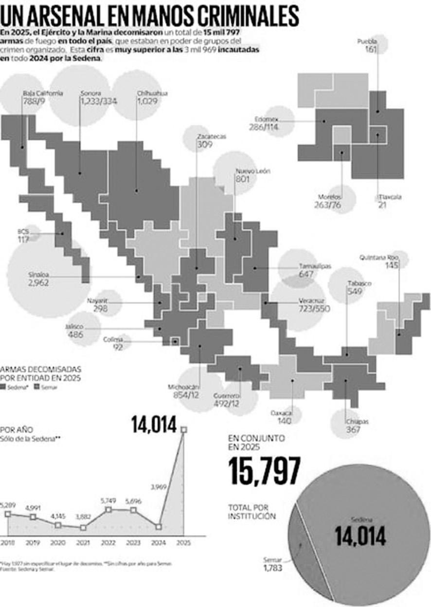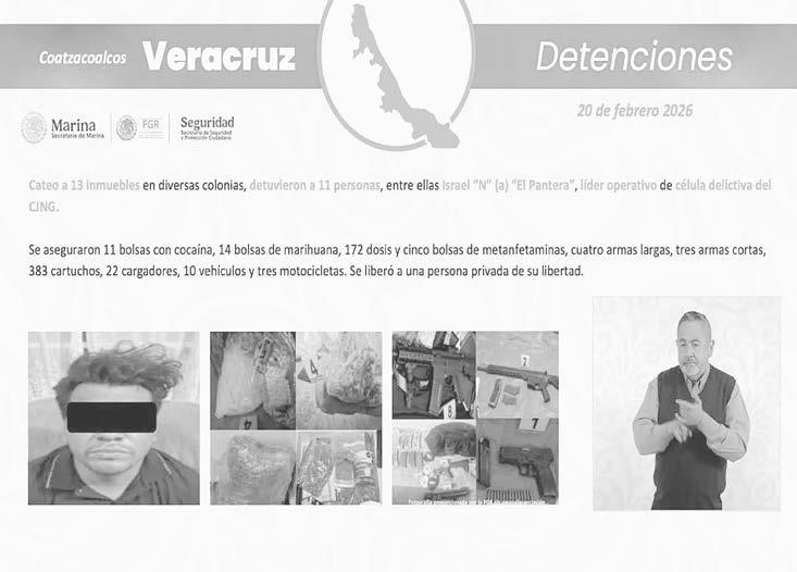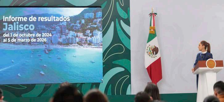 El secretario de Seguridad y Protección Ciudadana, Omar García Harfuch, informó que, en Jalisco, con la Estrategia Nacional de Seguridad, del 1 de octubre de 2024 al 28 de febrero de 2026 fueron detenidas 890 personas por delitos de alto impacto, se aseguraron 626 armas de fuego, más de 145 mil cartuchos, más de 10 toneladas de droga, incluyendo 3 mil pastillas de fentanilo y se desmantelaron tres laboratorios para la producción de metanfetaminas. Asimismo, con la Estrategia Nacional contra la Extorsión, del 6 de julio de 2025 al 31 de enero de 2026, la incidencia de este delito tuvo una reducción del 26.8 por ciento, se detuvieron a 44 personas y se aperturaron 257 carpetas de investigación.