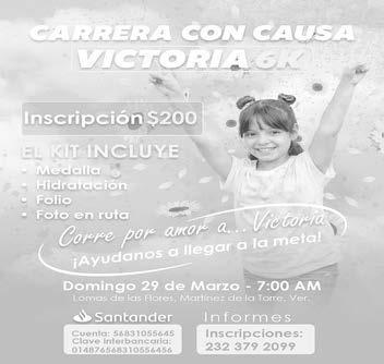 Una carrera con causa se llevará a cabo el próximo domingo 29 de marzo iniciando como Punto de partida en el parque de la comunidad Loma de las Flores del municipio de Martínez de la Torre, para apoyar el tratamiento de la pequeña Victoria.