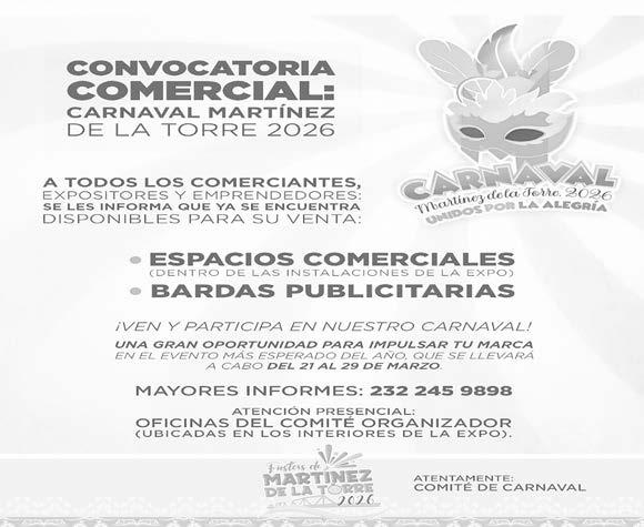 telefónico 232 245 9898, así como acudir directamente a las oficinas del Comité Organizador ubicadas en los interiores de la Expo. Con estas acciones, el H. Ayuntamiento de Martínez de la Torre impulsa la participación del sector comercial y emprendedor, fortaleciendo la actividad económica y promoviendo el desarrollo local en el marco de las festividades del Carnaval 2026.