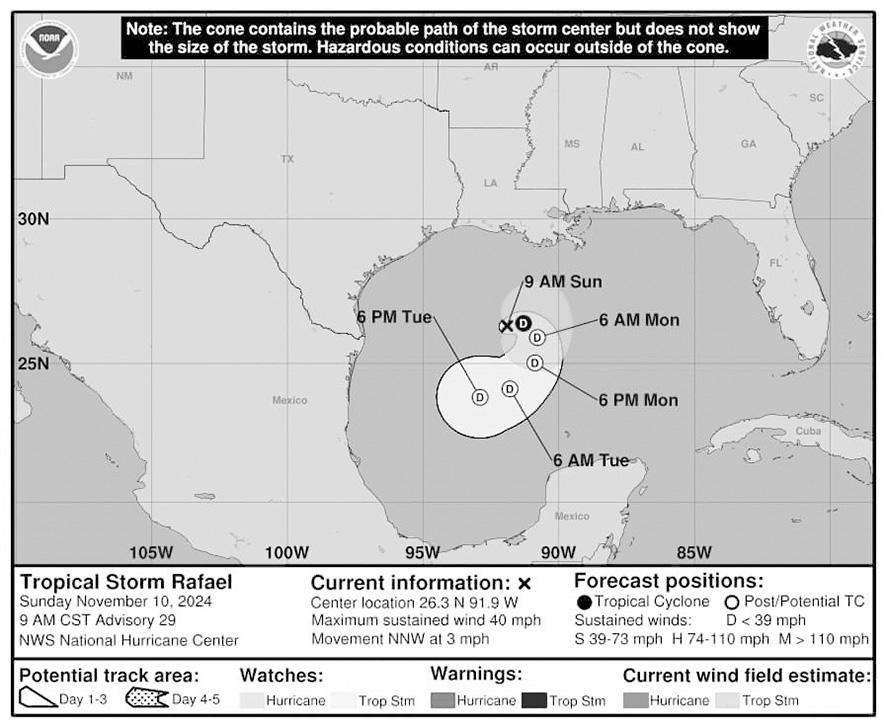 De acuerdo con el Servicio Meteorológico Nacional, Rafael se movía hacia el este a una velocidad de seis kilómetros por hora, con vientos máximos sostenidos de 55 kilómetros por hora.
