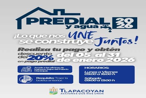 El Gobierno Municipal invita la ciudadanía a realizar su pago de predial, del 05 al 31 de enero de 2026 se realizará el 20% de descuento por pago oportuno, como parte de las acciones para fortalecer la participación ciudadana y fomentar la cultura de la contribución responsable.