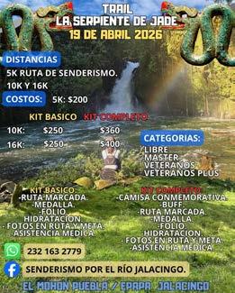“Invitamos a los corredores para que vivan la adrenalina al máximo el próximo 19 de abril en este Trail de 5, 10 y 16 kilómetros de senderismo por el río Jalacingo”, destacó la legisladora.