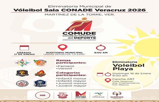 El H. Ayuntamiento de Martínez de la Torre, que preside nuestro presidente Modesto Velázquez Toral, a través de la Dirección de Deportes (COMUDE), llevará a cabo la Eliminatoria Municipal de Voleibol Sala CONADE Veracruz 2026, con el objetivo de impulsar el talento deportivo local y fomentar la sana competencia entre niñas, niños y jóvenes. La competencia se realizará el sábado 17 de enero, a partir de las 8:00 de la mañana, en el Auditorio Municipal de la Unidad Deportiva La Expo, donde se