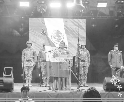 Acompañada del personal de la administración municipal, la Presidenta Municipal recibió la Bandera de manos de la escolta del 87° Batallón de Infantería, hizo sonar la campaña, recordando el momento en que Miguel Hidalgo y Costilla llamo al pueblo a luchar por la independencia de la Corona Española, y con voz firme sentenció: “MEXICANAS Y MEXICANOS, ¡Viva la Independencia de México!, ¡Viva Miguel